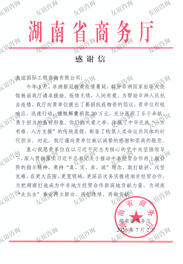 • 湖南省商務廳感謝信